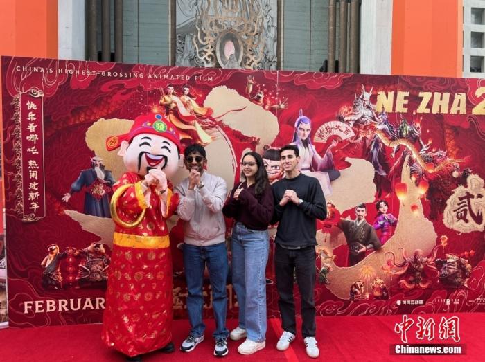 当地时间2月8日,中国影史票房冠军《哪吒之魔童闹海》(Ne Zha 2)洛杉矶首映礼在美国好莱坞中国剧院举行。图为观众在电影海报前与“财神”一起抱拳合影。中新社记者 张朔 摄