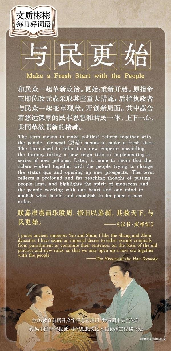 The term means to make political reform together with the people. Gengshi means to make a fresh start. The term used to refer to a new emperor ascending the throne, taking a new reign title or implementing a series of new policies. Later, it came to mean that the rulers worked together with the people trying to change the status quo and open up new prospects. The term reflects a profound and far-reaching thought of putting people first, and highlights the spirit of monarchs and the people working with one heart and one mind to abolish what is old and establish in its place a new order.