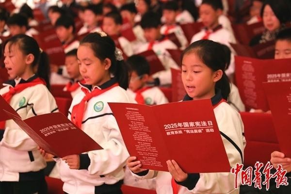 12月4日,北京育才学校,“宪法晨读”活动现场,学生跟读宪法部分条款。当日,国家宪法日教育系统“宪法晨读”活动在北京育才学校举行。自2014年以来,教育部每年组织全国各地大中小学生开展“宪法晨读”活动,加强青少年法治教育,有效营造尊法学法守法用法的良好氛围。中青报·中青网记者 陈剑/摄