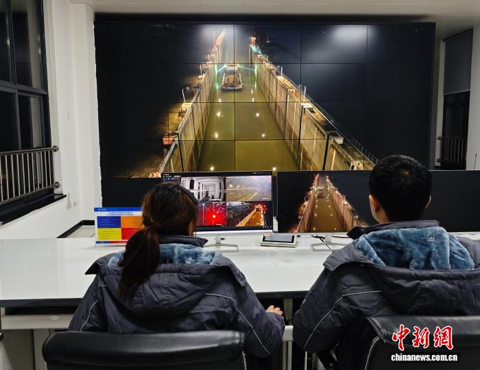 图为工作人员对夜航船舶放行。重庆市交通运输委员会供图