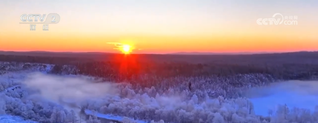 在黑河市逊克县克林镇,库尔滨水电站常年排放的4℃温水,与连日来寒冷的空气相结合,最终在库尔滨河两岸的树木上凝练成晶莹的雾凇。流动的河水蜿蜒向前,与岸边树林相映成趣,构成如诗如画的“雾凇画廊”。据了解,这里的雾凇景观从每年11月末会一直持续到次年3月初。